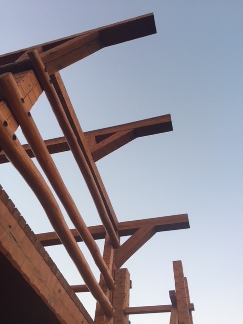 主屋のデッキ部分にも屋根をかけるので軸組設置です。