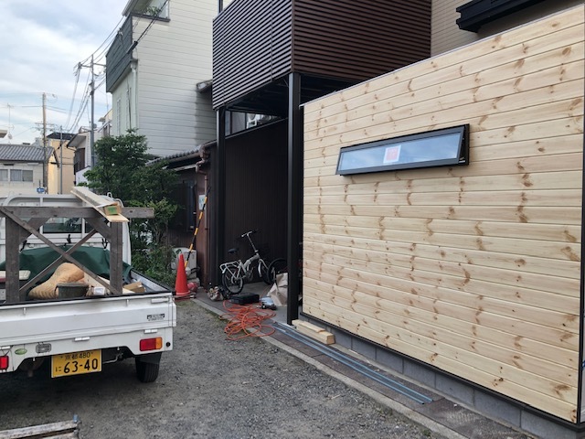 正面には木製のパネルを、側面にはサイディングを施工していきます。