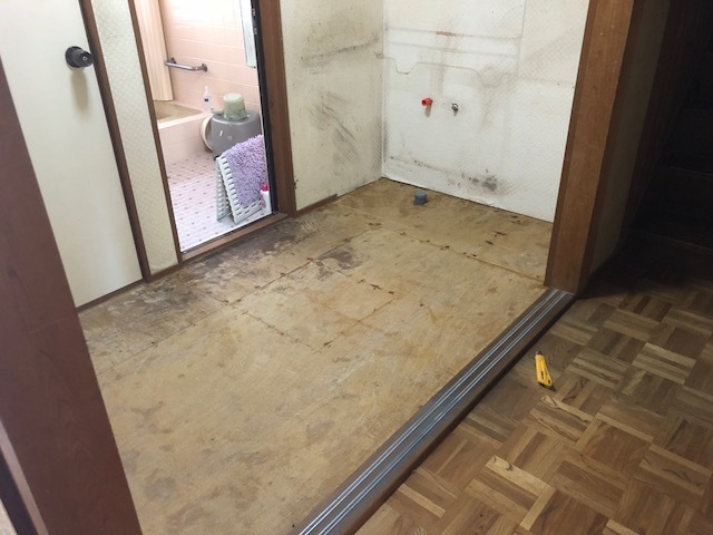 今回は、洗面・脱衣室の床張替え(クッションフロアをフローリングに)クロスの張替え(洗面裏クロスをタフウォールに)作業を行いました。部分リフォーム工事です。