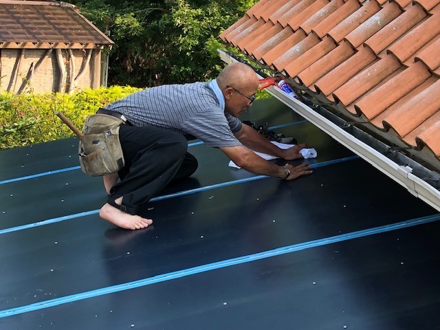 コーキングをして(屋根材が滑るので裸足になってます)