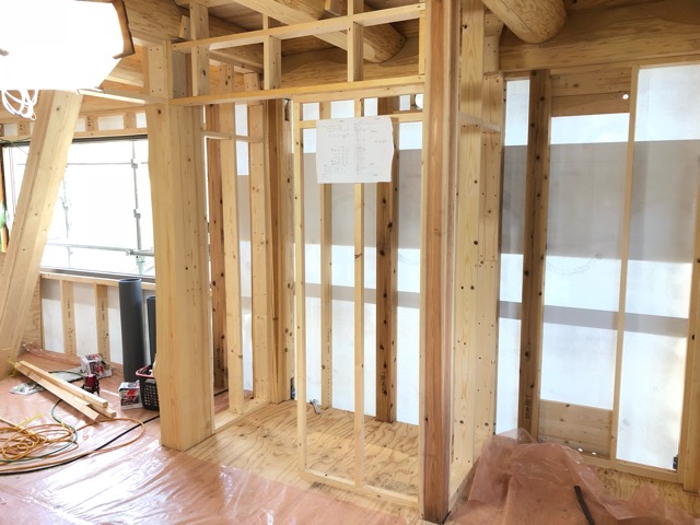 今日は、間仕切り壁の下地作業をメインに行いました。間柱を使って部屋を区切っていく作業です。