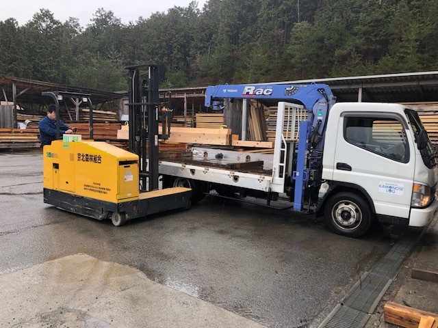 柱、土台に使用する材料は、地元京北森林組合で調達!雨の中でしたが、引取にいってきました。